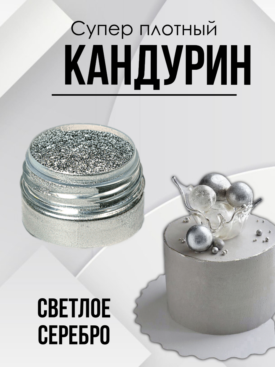 Краситель пищевой 2 в 1 жирорастворимый и водорастворимый. Идеально подходит для работы с мастикой, кремом и шоколадом (велюр в том числе). А так же его можно использовать для работы с аэрографом. Серебряный кандурин плотный, при поверхностном окрашивании позволяет получить плотную серебряную поверхность. Подходит как краситель для раскрашивания шоколадных фигурок, для надписей