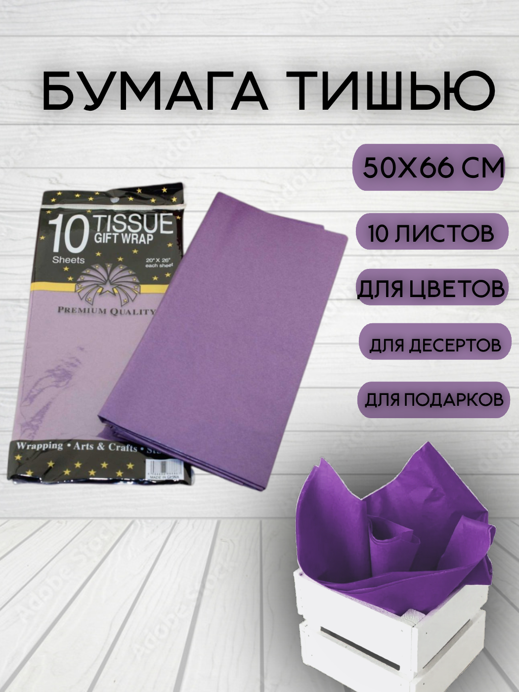 Тишью - это очень тонкая упаковочная бумага, которая применяется, в первую очередь, для упаковки разнообразных товаров. Ею заполняют пустые пространства в подарочных пакетах, сумках и коробочках. Размер 50х66 см. В упаковке 10 листов.