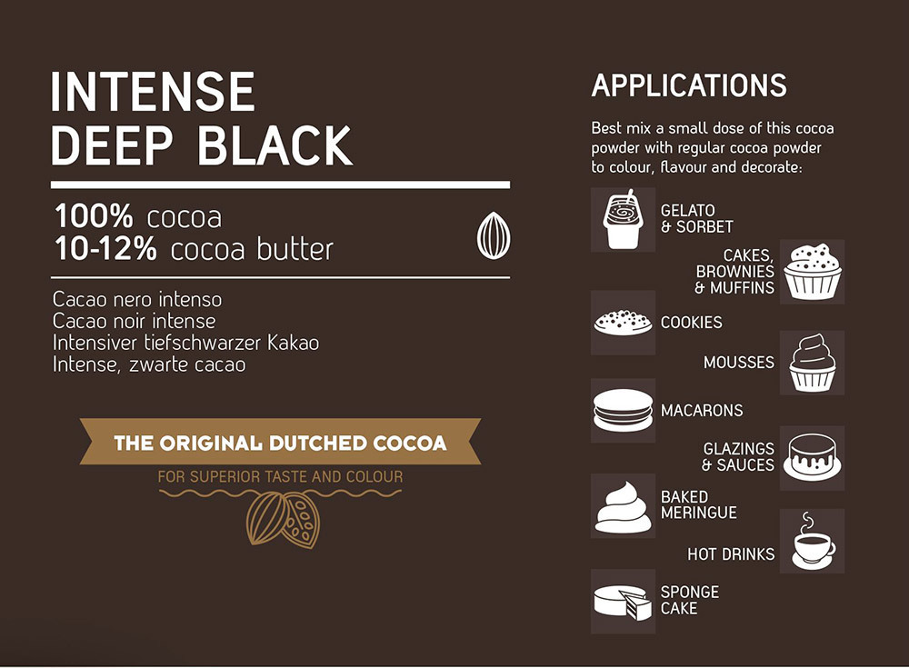 Vanhouten Intense Deep Black – это алкализованный какао порошок. Хорошо растворяется в воде. Используется в сочетании с обычным какао порошком для придания черного цвета кондитерским изделиям и усиления вкуса какао. Области применения: