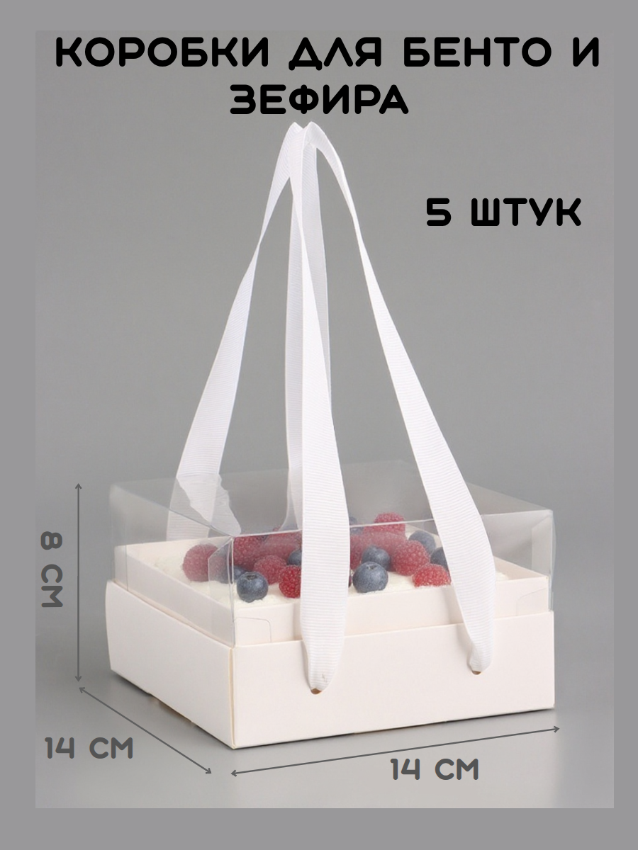 Миниатюрная витрина для сладкого сюрприза! Маленькая коробка под бенто-торт и зефир с прозрачной крышкой и ручками – это компактная упаковка для небольшого десерта. Её чистый цвет и обзорная крышка делают содержимое главным акцентом. Также подойдет как коробка для моти и клубники в шоколаде. В комплекте 5 коробок с ручками из лент