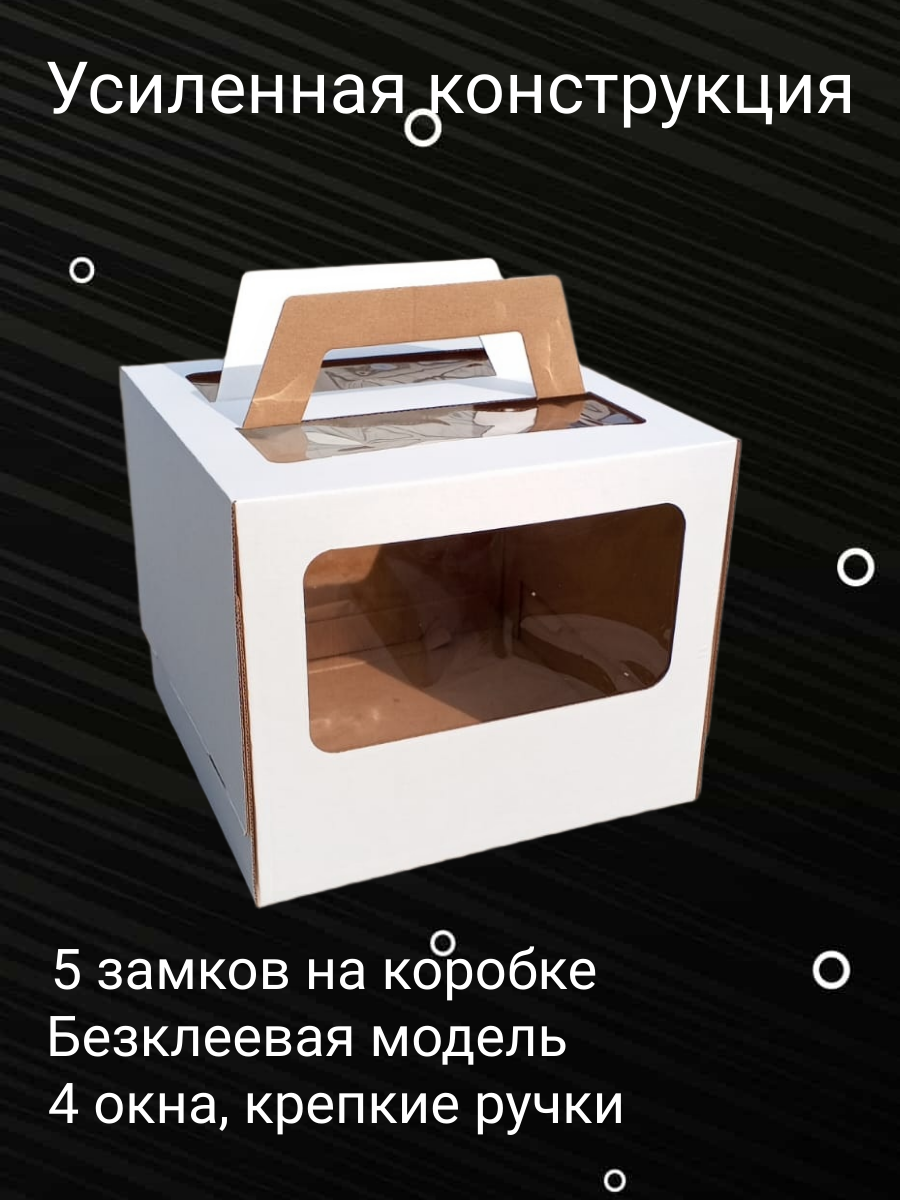 Коробка для торта с ручками и окнами белая - эффектный и экологичный завершающий штрих для упаковки торта и десерта. В комплекте 5 самосборных бесклеевых коробок. Усиленная конструкция с 5 замками выдержит самый увесистый торт. У коробки 4 крупных окна, что обеспечивает прекрасных обзор вашему десерту. Упаковка для торта с ручками и окном - лучший выбор кондитера