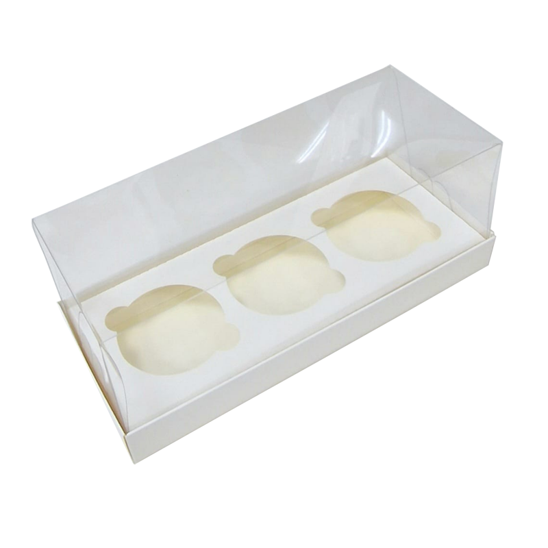 Конструкция коробки: пластиковая крышка + картонное дно + ложемент на 3 капкейка, маффина или краффина.