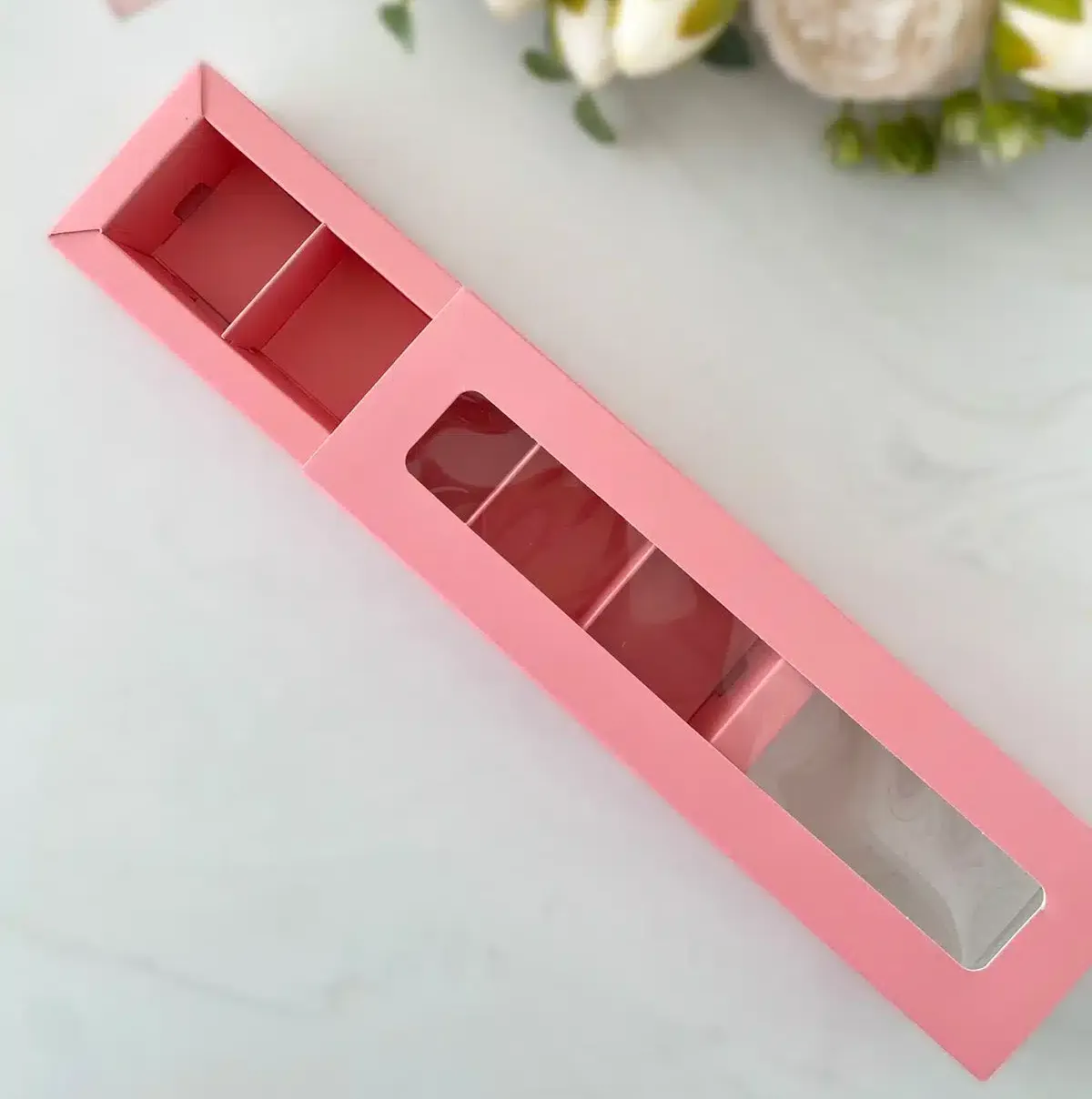 - Размеры коробки составляют 22 х 5,5 х 3,5 см, что позволяет разместить внутри 5 конфет.