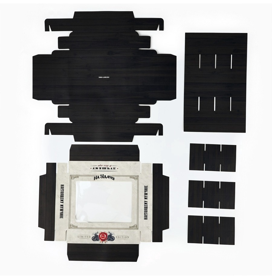 Практичность и стиль: Крафтовая коробка из плотного картона напоминает о прочности и надежности – качествах настоящего мужчины. Ее строгий черный цвет придает упаковке элегантность и универсальность.
