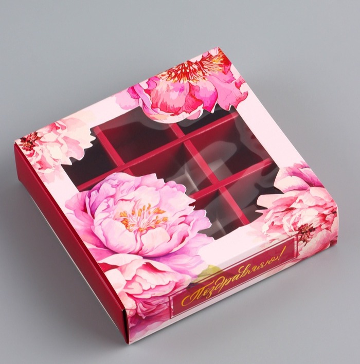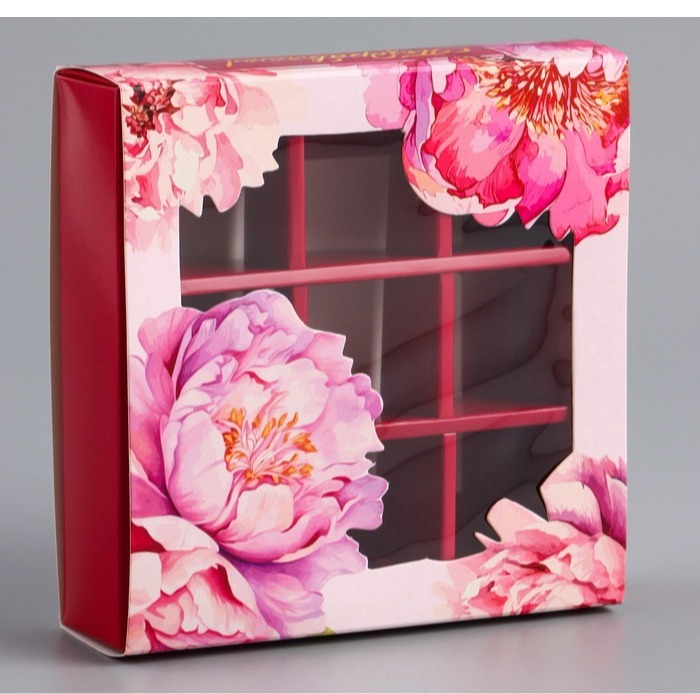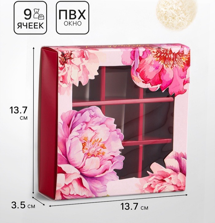 - Размер 13,7 х 13,7 х 3,5 см подходит для упаковки 9 конфет.