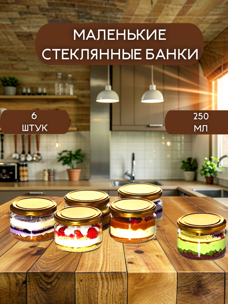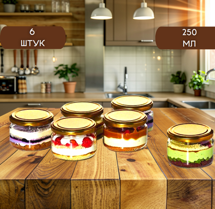 Баночки, вместимостью 250 гр для домашней карамели, холодных чизкейков, муссовых порционных пирожных. С герметично завинчивающейся металлической крышкой. Высота 7 см, диаметр банки 8.5 см.