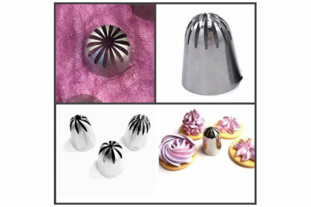 Насадка для кондитерского мешка f1 Закрытая звезда предназначена для украшения десертов. Большая кондитерская насадка номер 903 идеально подойдёт для отсадки зефира. Насадка Роза винтовая используется для оформления кондитерских изделий, работы с кремом, украшения большими цветами, крупных роз на торт, на маффины. С помощью данной крупной насадки легко получить капкейки с идеальной аппетитной шапочкой. Так же подойдёт для декорирования закусок густыми соусами и маслом. Крем может иметь разный вид, в зависимости от силы нажатия на кондитерский мешок, угла наклона насадки и характера движения руки. Насадки предназначены для нанесения на выпечку необычных украшений из крема.