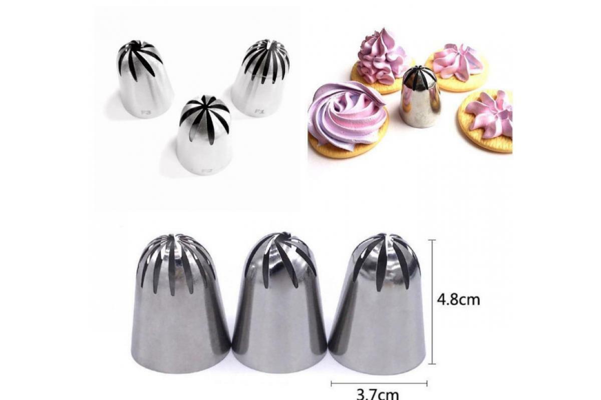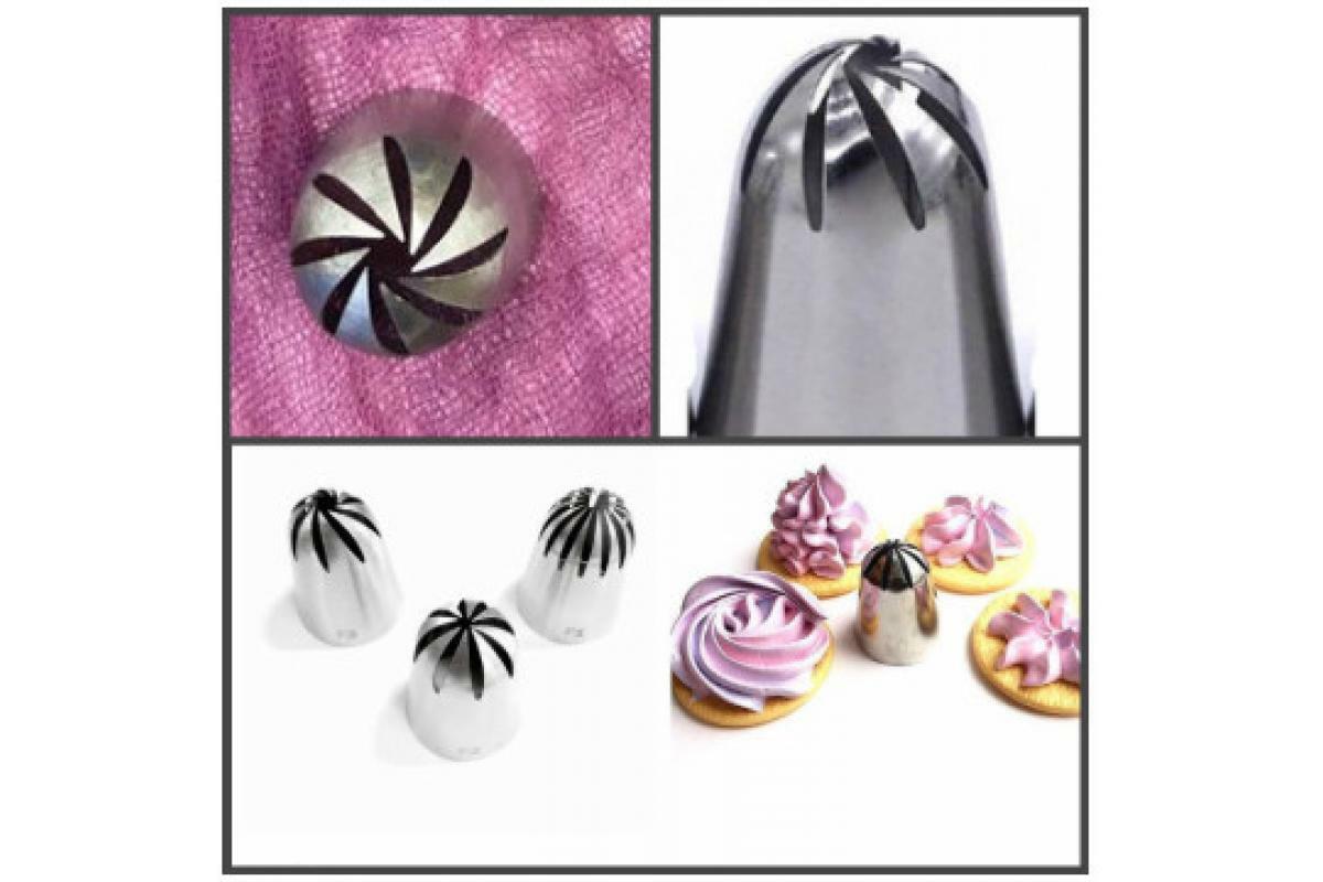 Насадка для кондитерского мешка f3 Закрытая звезда предназначена для украшения десертов. Большая кондитерская насадка номер 903 идеально подойдёт для отсадки зефира. Насадка Роза винтовая используется для оформления кондитерских изделий, работы с кремом, украшения большими цветами, крупных роз на торт, на маффины. С помощью данной крупной насадки легко получить капкейки с идеальной аппетитной шапочкой. Так же подойдёт для декорирования закусок густыми соусами и маслом. Крем может иметь разный вид, в зависимости от силы нажатия на кондитерский мешок, угла наклона насадки и характера движения руки. Насадки предназначены для нанесения на выпечку необычных украшений из крема.