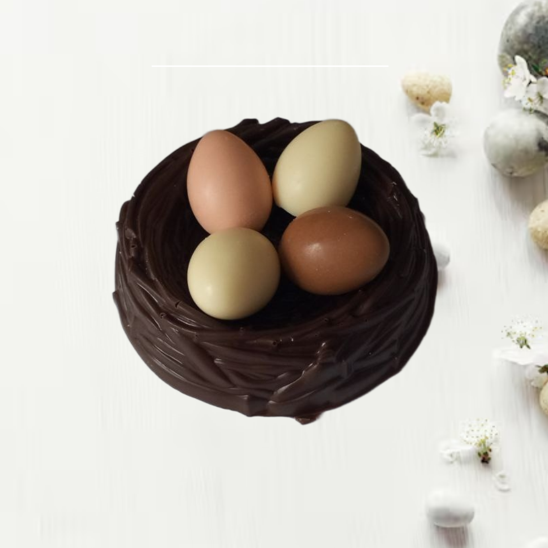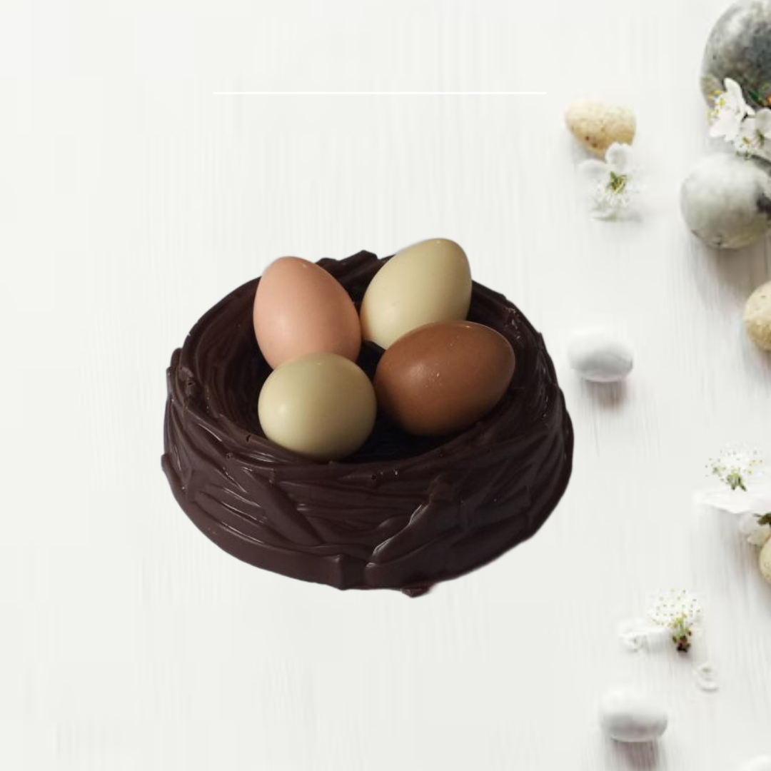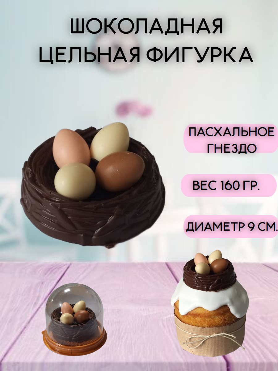 Диаметр 8.5 см. Шоколадная фигурка для украшения кулича изготовлена из шоколадной глазури и пищевых красителей. В комплекте гнездо и 4 яйца, цвет бежевый микс. Вес ориентировочно 160 гр.