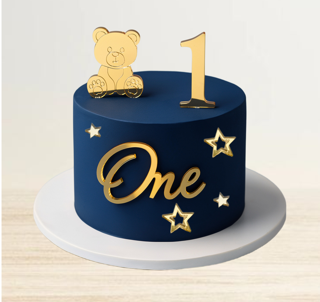 Набор из зеркального золотого акрила с надптсью One, фигуркой медвежонка, цифрой 1 и зеркальных звездочек для торта